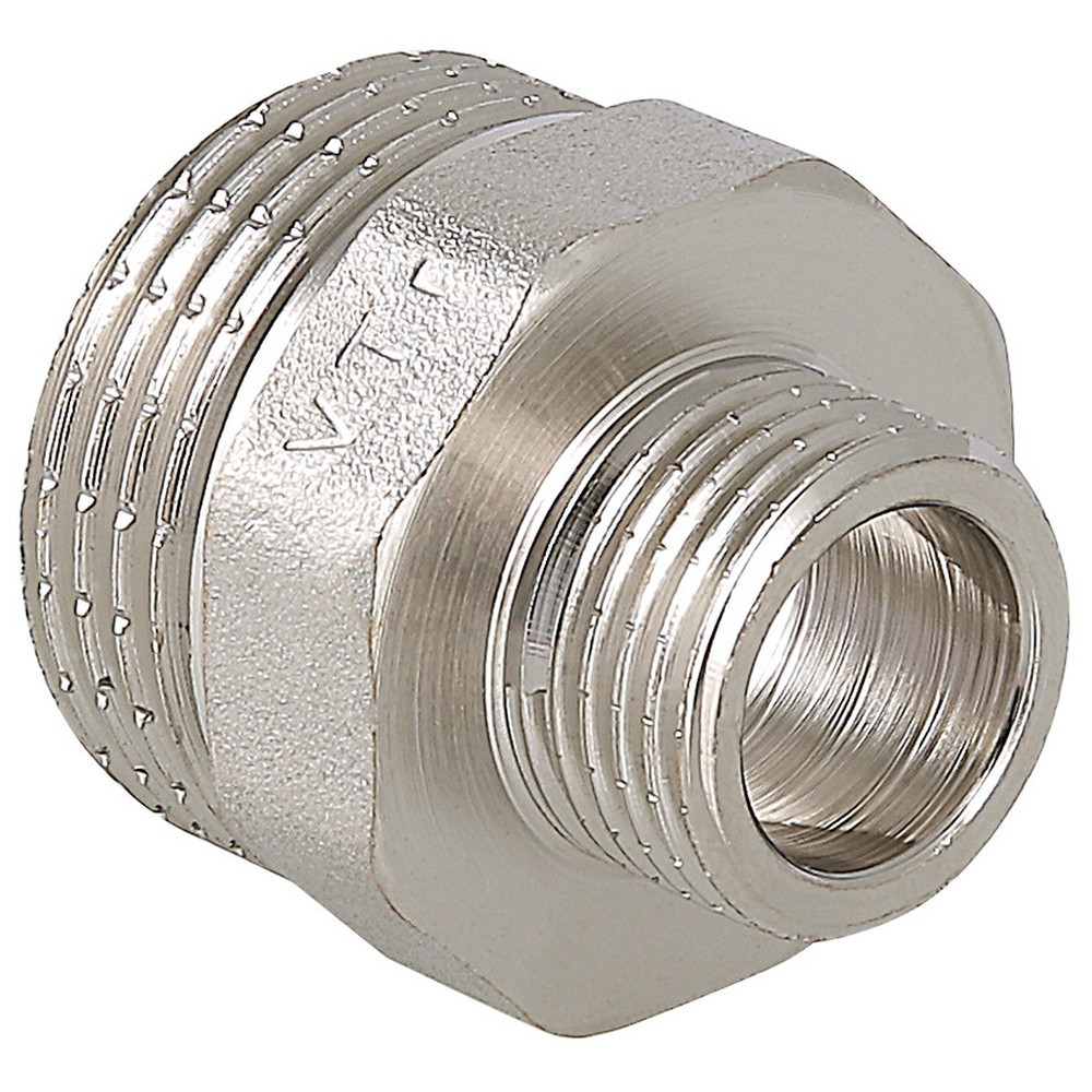 (VTr.580.N) Резьбовой фитинг – ниппель переходной. Обеспечивает соединение элементов трубопровода разного диаметра. Выполнен из латуни CW617N (евростандарт EN12165) горячим штампованием с последующим никелированием. Резьба обоих патрубков – наружная (тип – цилиндрическая трубная, ГОСТ 6357, ISO 228, EN10226). Насечки на резьбе способствуют удержанию герметизирующего материала (например, сантехнического льна). Наличие шестигранного (под гаечный ключ) участка корпуса облегчает монтаж соединения. Максимальная температура использования ниппеля составляет 250 °С (при максимальном рабочем давлении 2,7/1,7 МПа – для моделей условным диаметром до/более 1”).