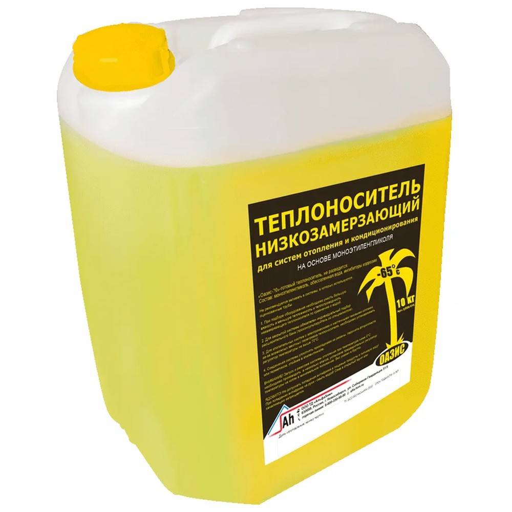Теплоноситель в отоплении и кондиционировании применяют для запуска систем при отрицательных температурах. Теплоноситель Оазис - 65 — концентрат на основе моноэтиленгликоля с температурой начала кристаллизации -65 °С. Рекомендуется разводить подготовленной водой, в пропорции (часть теплоносителя / часть воды) 5/1 температура начала кристаллизации -40 °С 2/1 температура начала кристаллизации -30 °С 1/1 температура начала кристаллизации -20 °С Применяется в герметичных, закрытых системах.