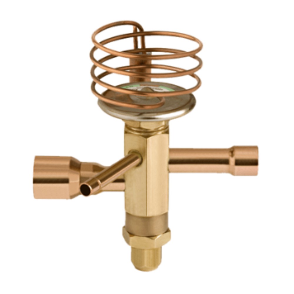 Корпус вентиля изготовлен из латуни. Соединительные патрубки имеют прямоточную конфигурацию. Движения диафрагмы силового элемента перемещают стальной калиброванный шток клапана. При повышении давления в термобаллоне диафрагма прогибается вниз, и движение передается штоку. Он перемещается в седле и позволяет жидкости проходить через отверстие. Конструкция штока обеспечивает сбалансированную характеристику порта. Сбалансированность порта устраняет нежелательное влияние изменения давления на входе, то есть давления конденсации при различных температурах окружающего воздуха в системах с воздушным охлаждением конденсатора. Сбалансированная конструкция порта действует только при одном направлении потока, которое указано стрелкой на вентиле. Это означает, что, когда вентиль работает как двунаправленный в тепловом насосе, преимущество сбалансированной конструкции порта сохраняется только в режиме охлаждения или только в режиме подогрева. Для противодействия силе передаваемой штоком вниз установлена пружина, жесткость которой может быть отрегулирована внешним винтом настройки. Вращением данного регулирующего винта может быть перенастроен статический перегрев: при повороте винта по часовой стрелке он увеличивается, и соответственно при повороте против часовой стрелки – уменьшается.