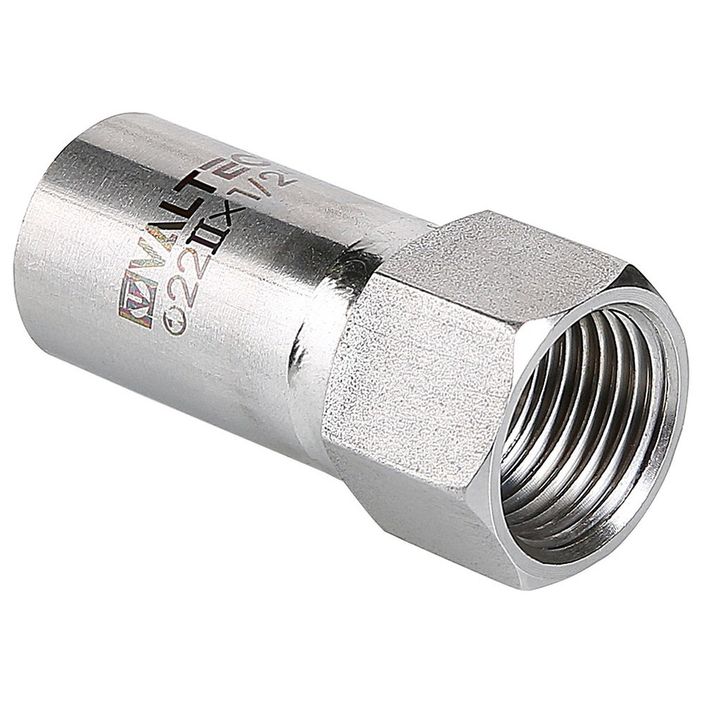 (VTi.907.I) Вставка с внутренней резьбой VTi.907.l предназначена для использования совместно с пресс-фитингом системы VALTEC INOX-PRESS при монтаже трубопровода из нержавеющей стали – для перехода с пресс-соединения на резьбовое. Изделие изготовлено из стали AISI 304.